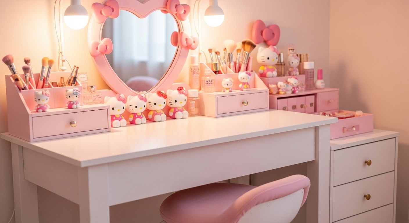 Design a cute beauty corner with a white vanity desk, heart-shaped mirror, and small Hello Kitty figurines. Decorate with pink bow accents and pastel organizers for a tidy yet adorable look.