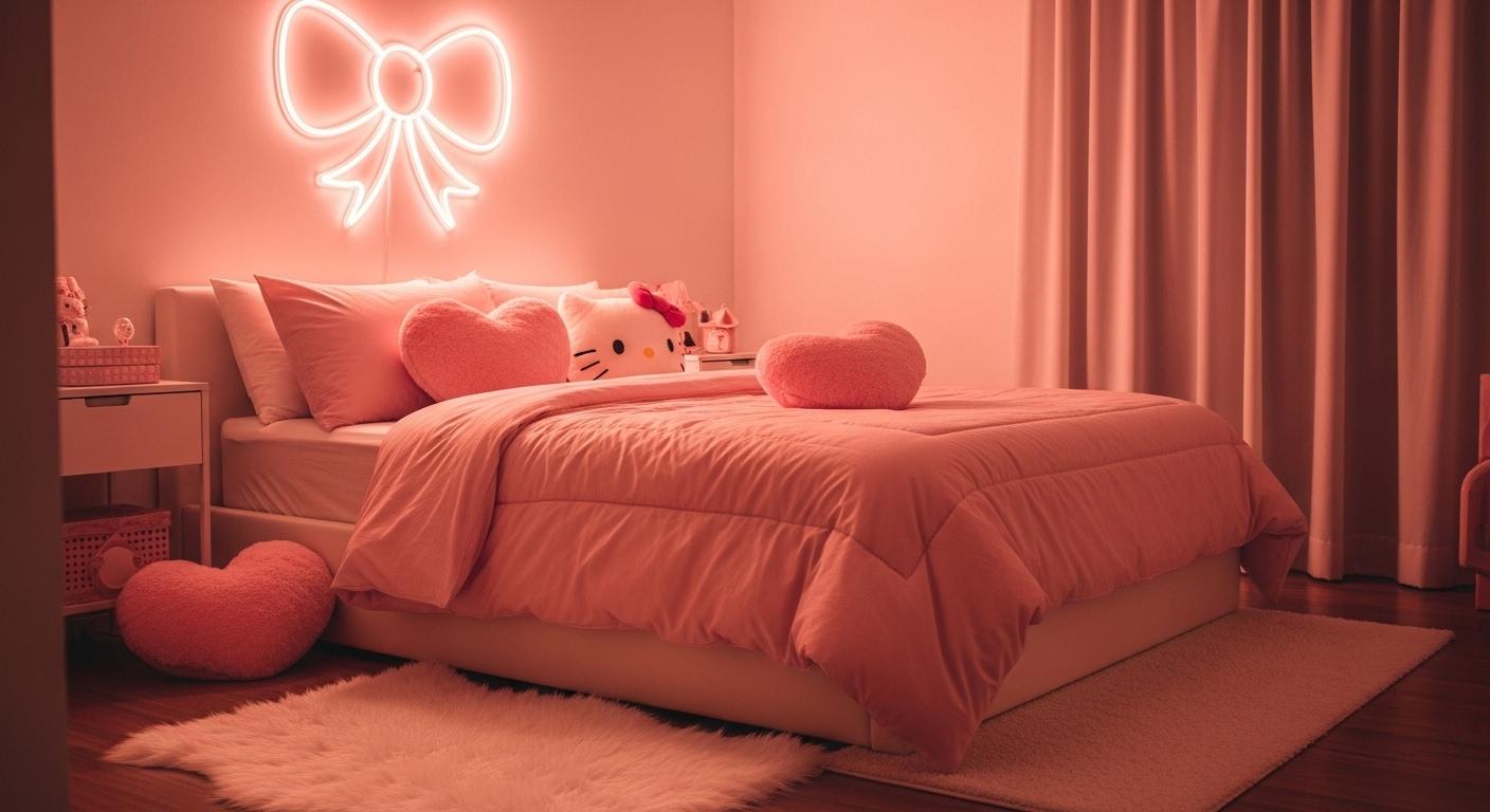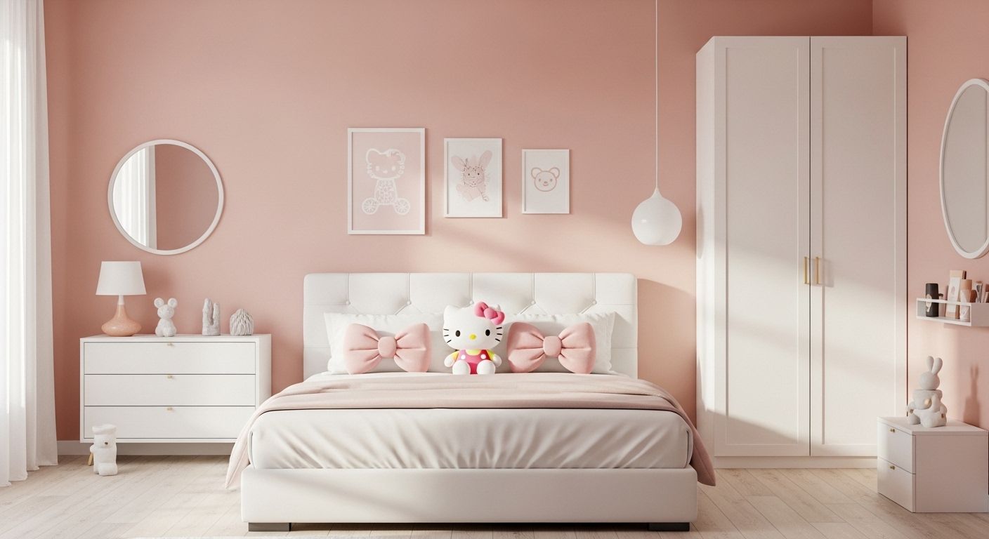 Create a cozy focal point with blush pink bedding layered with Hello Kitty pillows and plushies. Add a fluffy white throw blanket and soft fairy lights behind the headboard for a dreamy glow. Keep furniture white to make the pink pop beautifully.